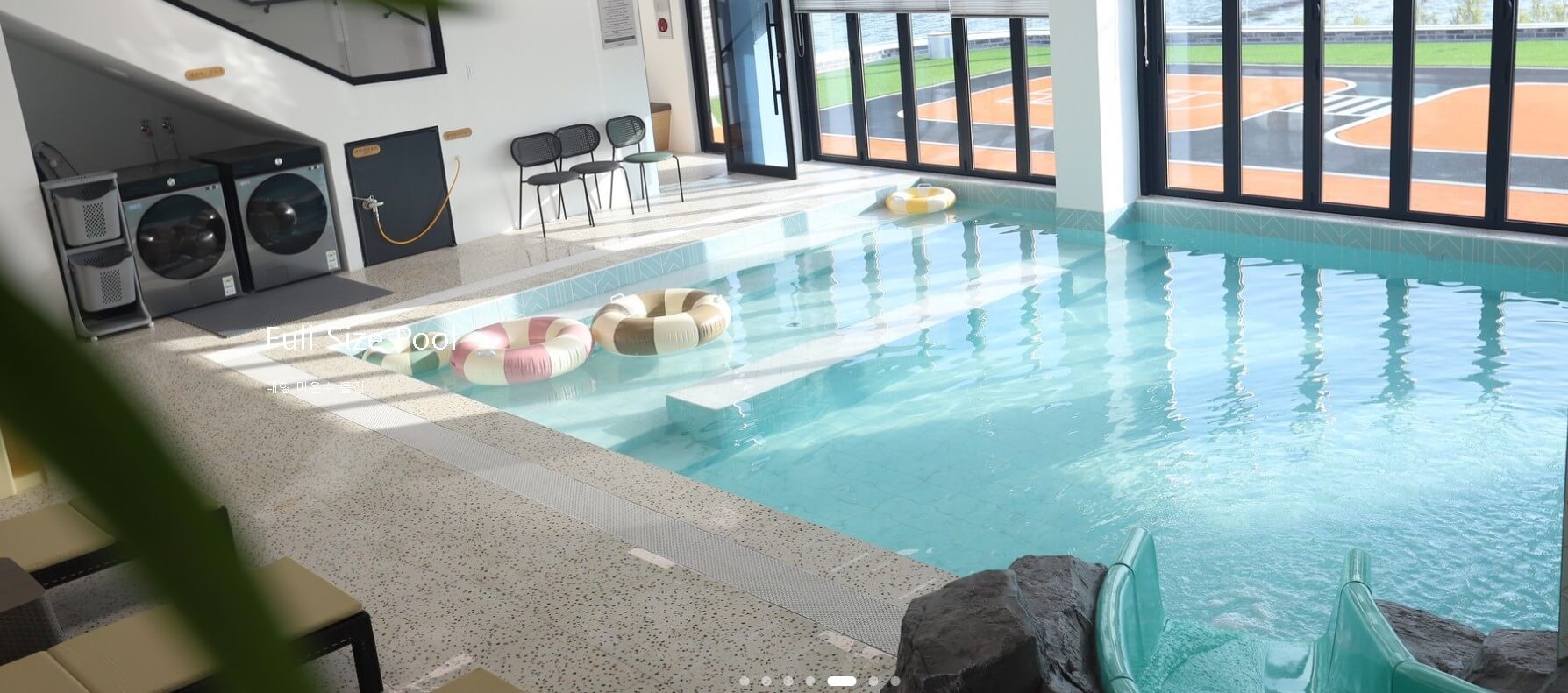 대형 미온수 풀장은 사계절 프라이빗 하게 이용가능하며, 커스텀 워터 슬라이드가 있어 특별한 즐거움을 선사해 줍니다.