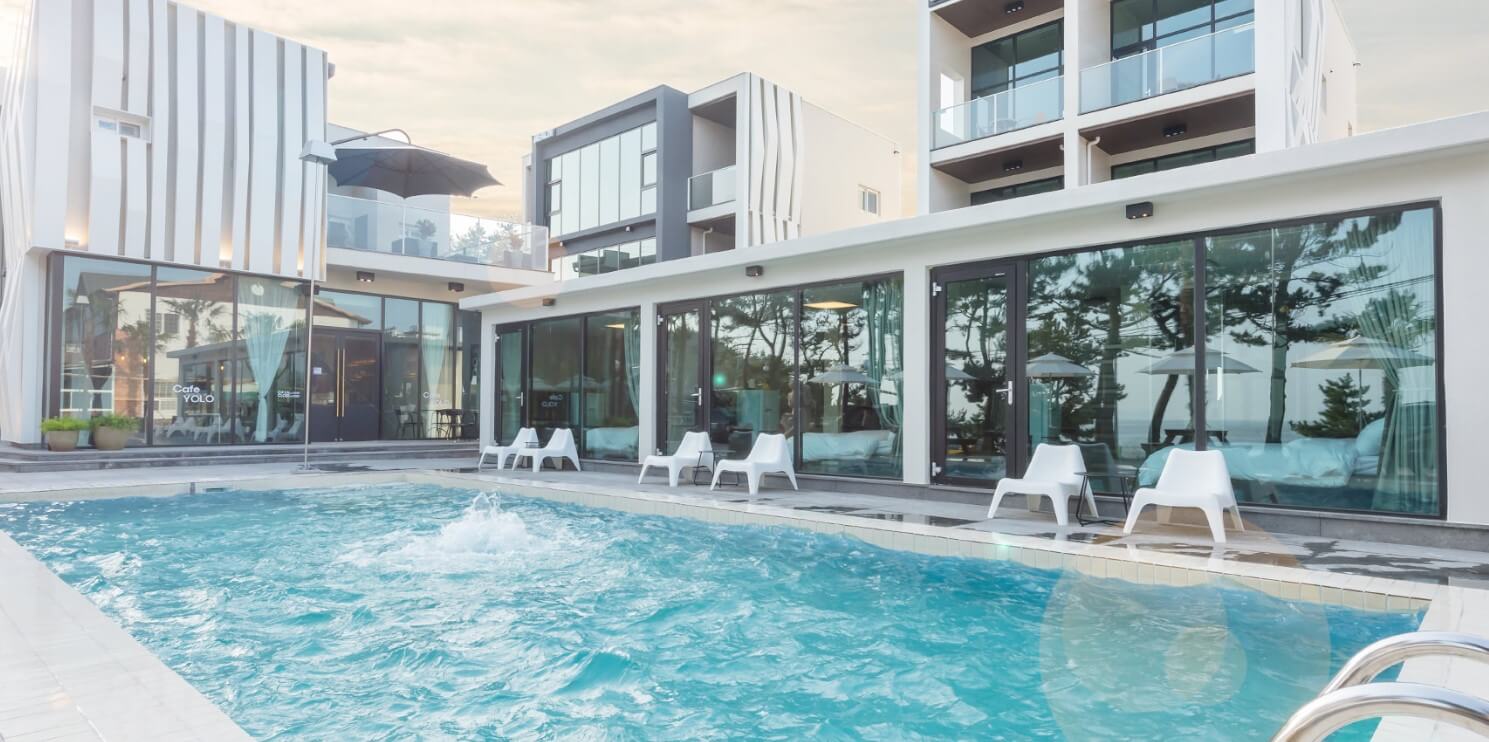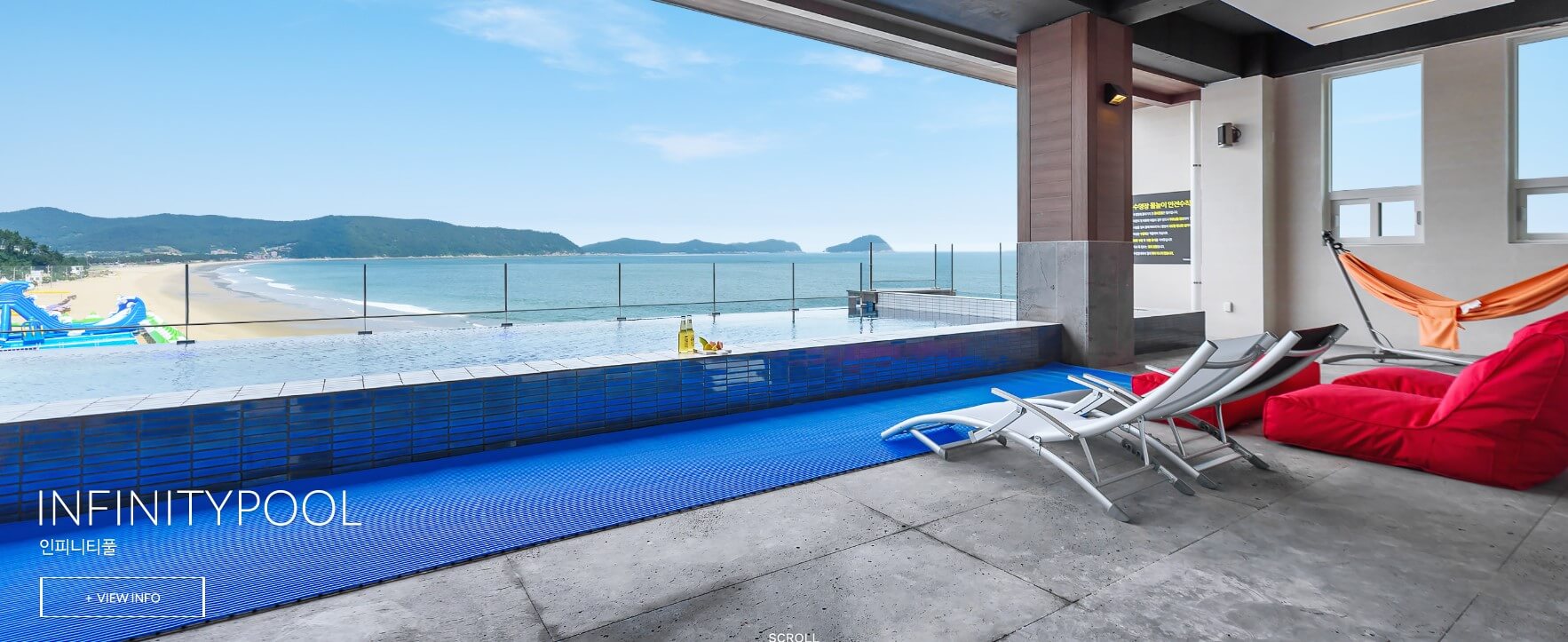 하늘과 바다 그리고 풀장이 하나가 되어 보이는 인피니티풀장이 있으며 전 객실 오션뷰를 즐길 수 있습니다. 여행에 빠질 수 없는 바비큐는 루프탑에서 즐길 수 있으며 아름다운 명사십리해변과 자연을 조망할 수 있는 망원경이 설치되어 있습니다.